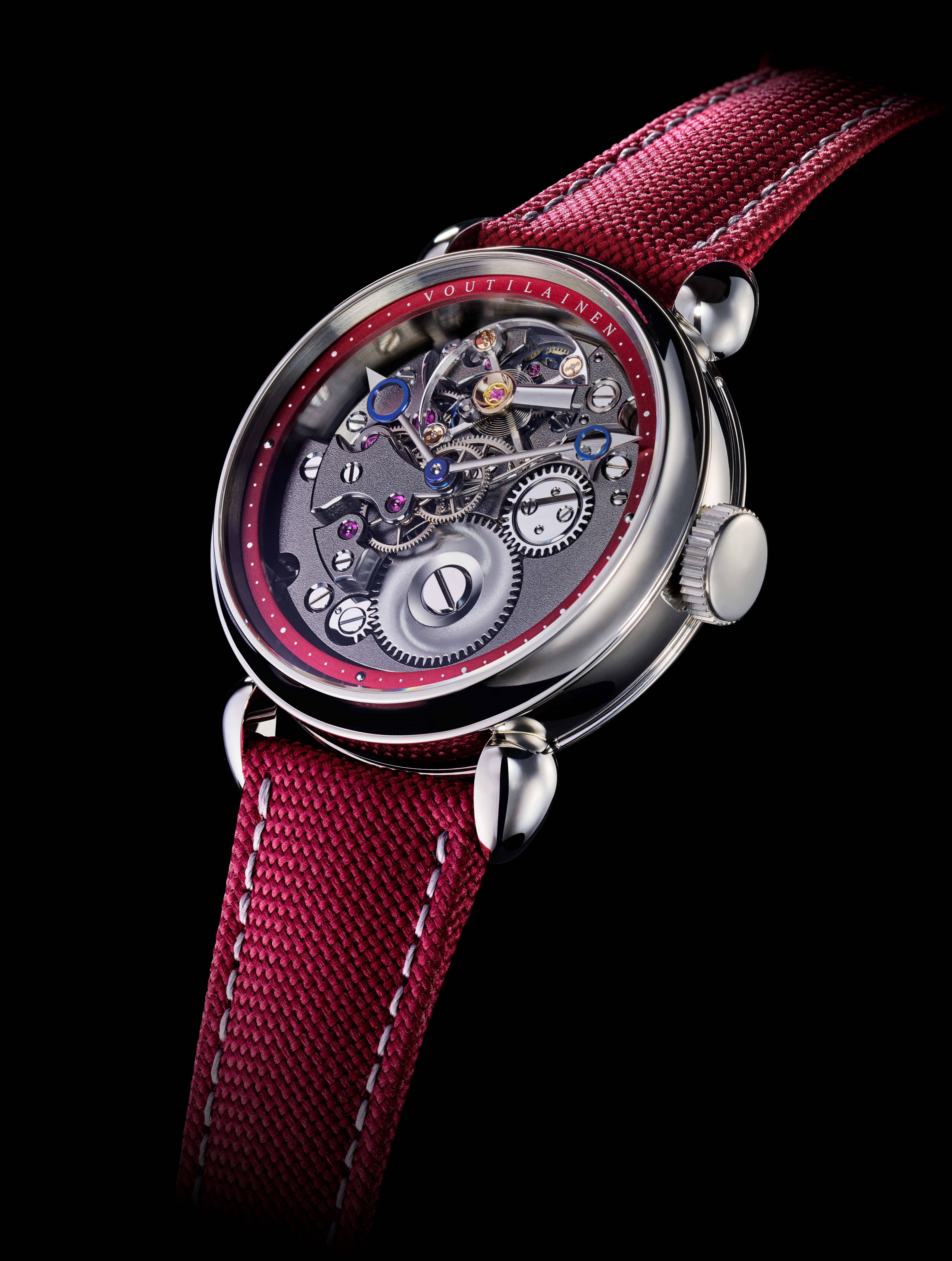 裏面にはフランジと秒針のサブダイアルが付きます。「KV20i リバース」の新作は、チェリーカラーなどの新色のアクセントに加え、伝統的な手動機械を用いて、厚さ0.8mmのシルバー板材の上に、0.2〜0.3mmの深い複雑なギヨシェ装飾を施すことが可能になりました。