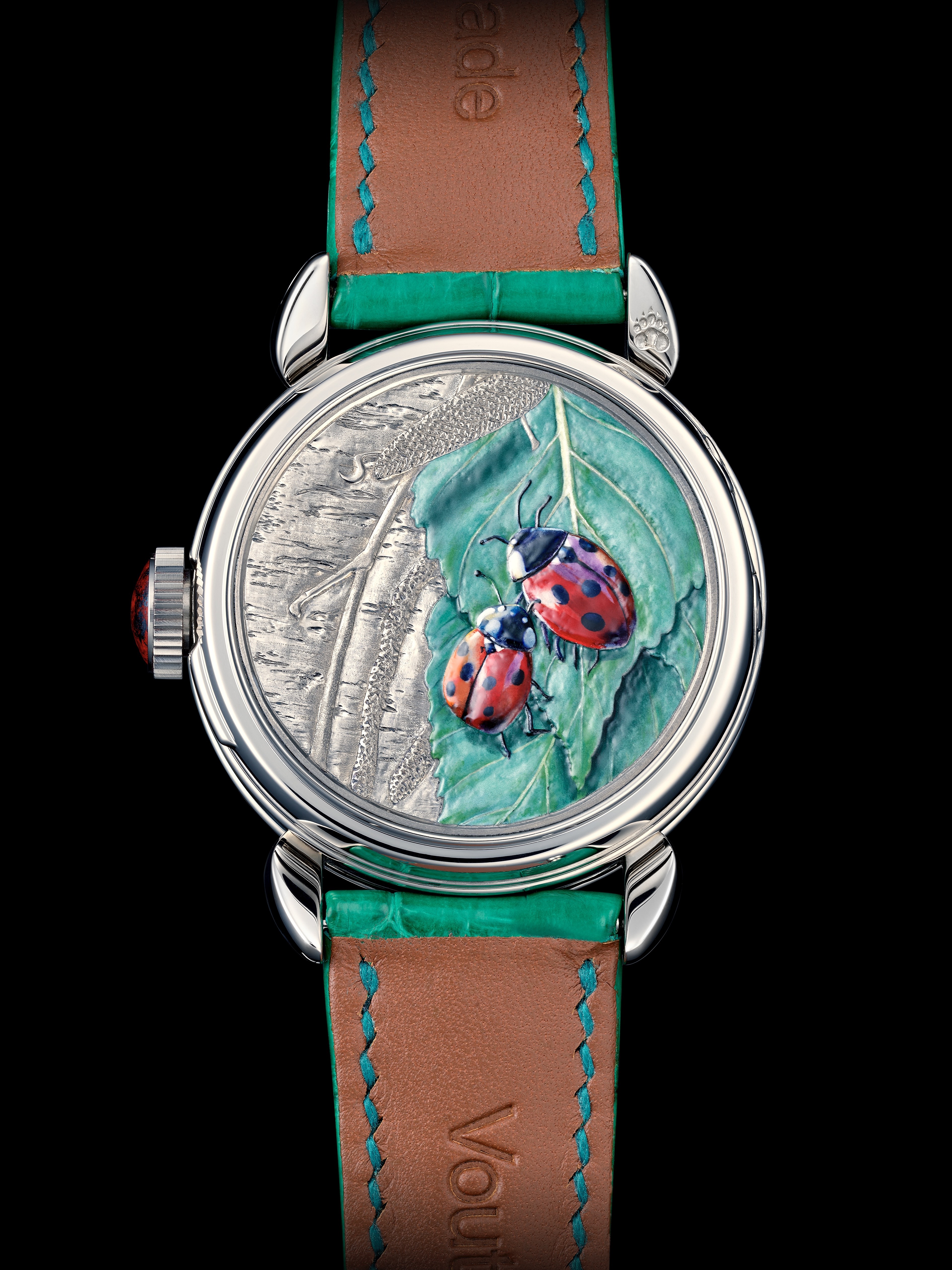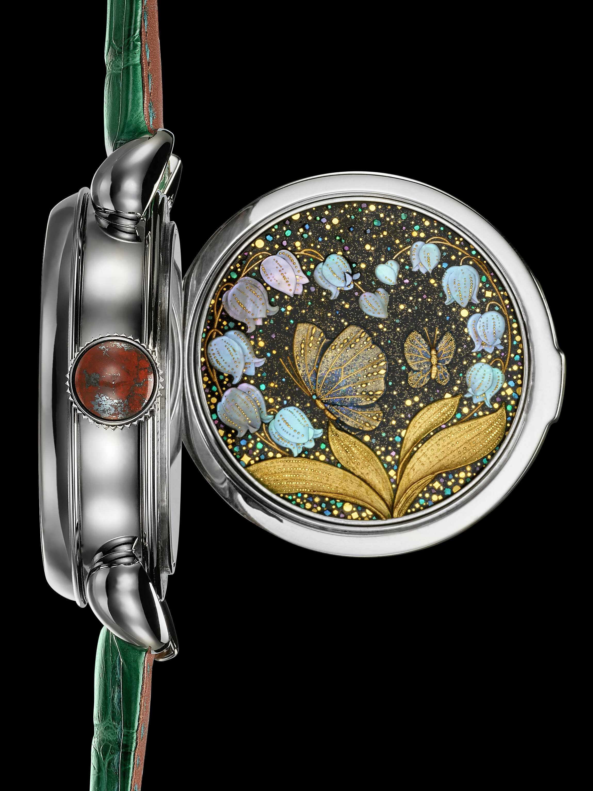 裏蓋の外側には、美しい手彫りとエナメルが施され、シラカバ(国樹)の葉に静かに休む2匹のナナホシテントウ(国虫)が描かれています。内側には、スズランの花(国花)と2匹のヒイラギチョウ(国蝶)が漆芸技法で描かれています。花には手作業でスライスした白蝶貝を使い、花びら一枚一枚が丁寧に形作られています。蝶の羽、花びら、背景の装飾の色合いは、見る角度や光によって微妙に変化します。