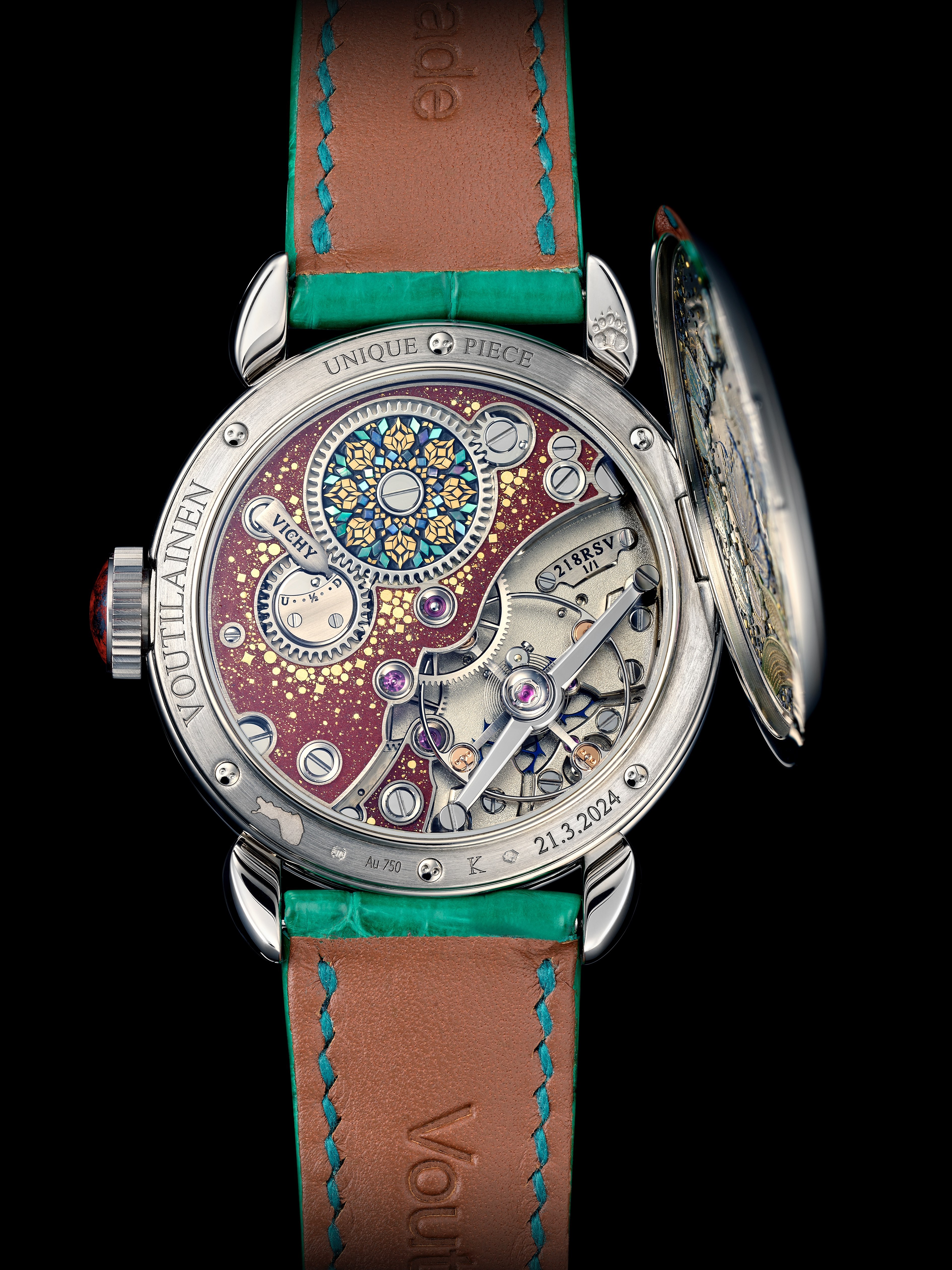 1000時間以上の作業時間を要する北村工房独自の漆芸技法「彩影蒔絵」や伝統的な手彫りの彫金とエナメルの技法を用いた精緻な芸術性と、タイムピースの持続性や精度追求など、ヴティライネン工房の伝統的な時計製造という哲学を融合させた、他に類を見ない傑作です。