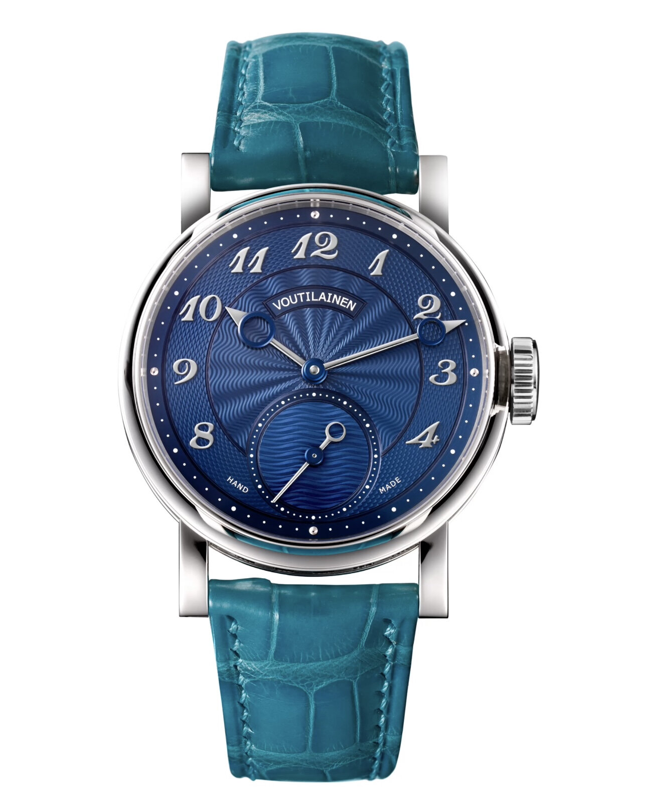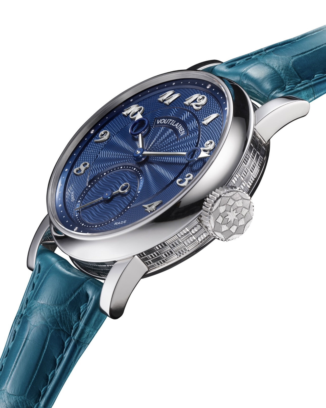 新作「ヴァントゥイット 28CG」は、ケース径37mmとラグ幅20mmのストレートラグを採用し、文字盤面に加え、ケース側面とリュウズ頭部にも伝統的な手動旋盤機械を用いて0.2〜0.3mmの深く複雑なギヨシェ彫りを施しています。