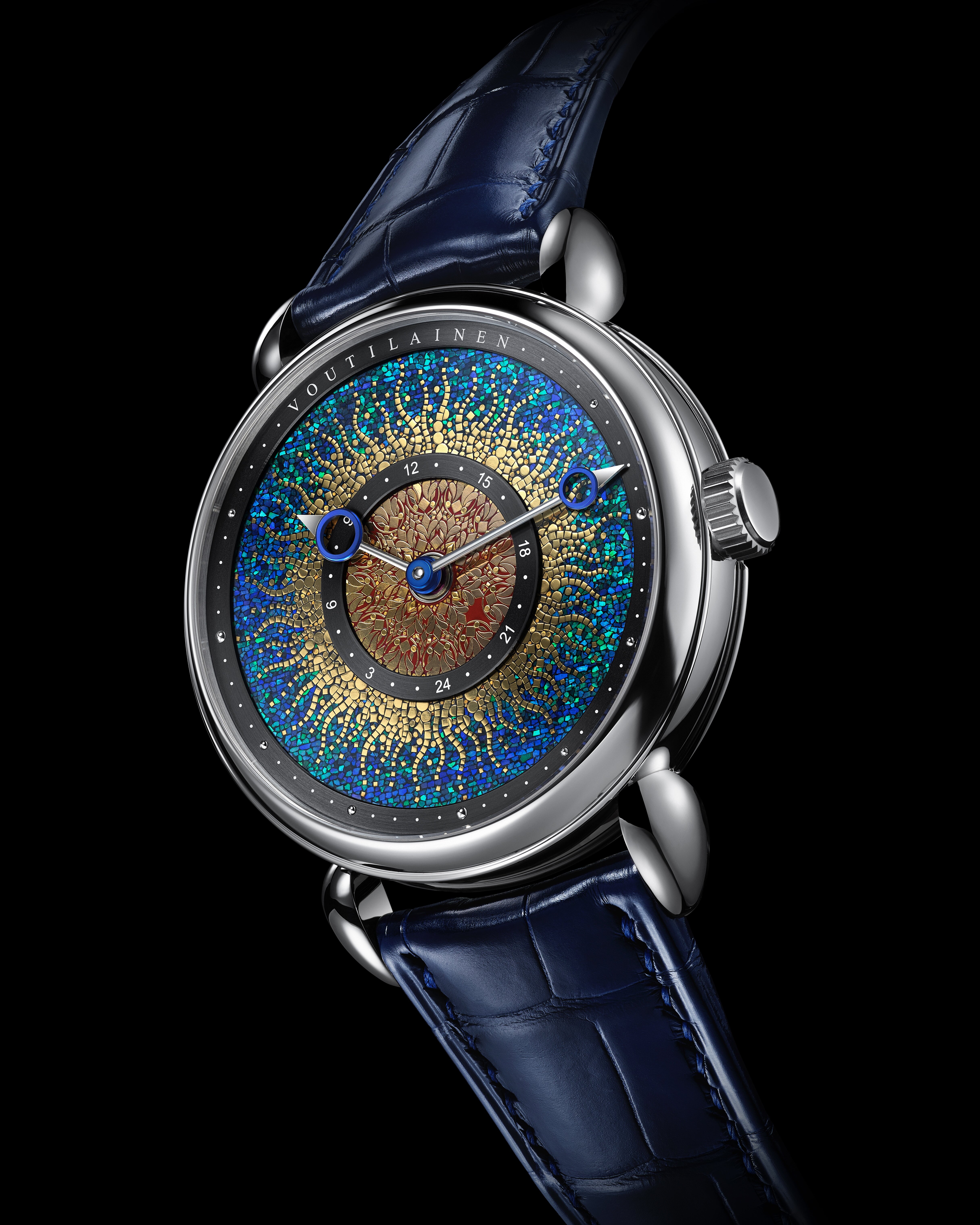 魅惑的な文字盤は、「SOUYOU(蒼陽)」というモットーから着想を得ています。これは、青、緑、金、赤の鮮やかなコントラストに込められた造語です。文字盤の外側に配された「SOU(蒼)」は、深く澄んだ青緑色で海を想起させ、 第2タイムゾーン表示の24時間回転ディスクを中心に、金と赤の陰影で太陽エネルギーを象徴する自然の有機的なフォルム「YOU(陽)」を表現しています。北村工房の漆技法「彩影蒔絵」を用いて制作されたこの文字盤は、1,000時間を超える緻密な作業を経て完成します。この制作には、漆、金粉、切金、切貝といった天然素材が贅沢に用いられています。