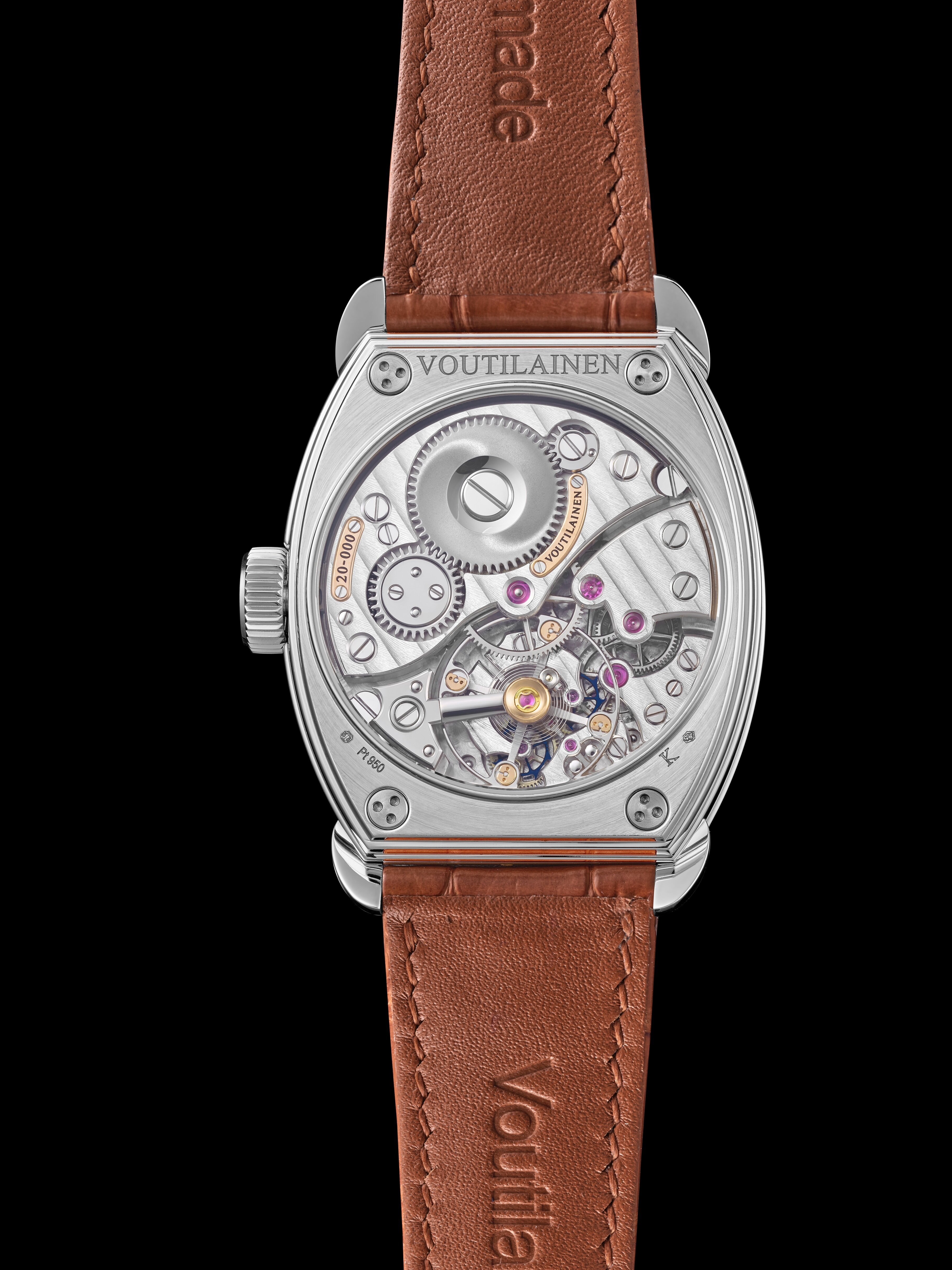 ケースバックからは、キャリバー KV20の精緻な機構と、ヴティライネン時計工房の熟練職人による最高水準の表面仕上げを覗き見ることができます。ムーヴメントの手仕上げは、精度、耐久性、そして伝統への敬意を常に追求する時計芸術の価値に対するヴティライネンのこだわりを反映しています。カナや歯車の表面は完全に平坦で、極めて均一な公差で研磨されています。洋銀製の地板と受けは手作業で装飾され、ネジ駆動部からすべてのスティール部品の表面が手作業で入念に研磨されています。